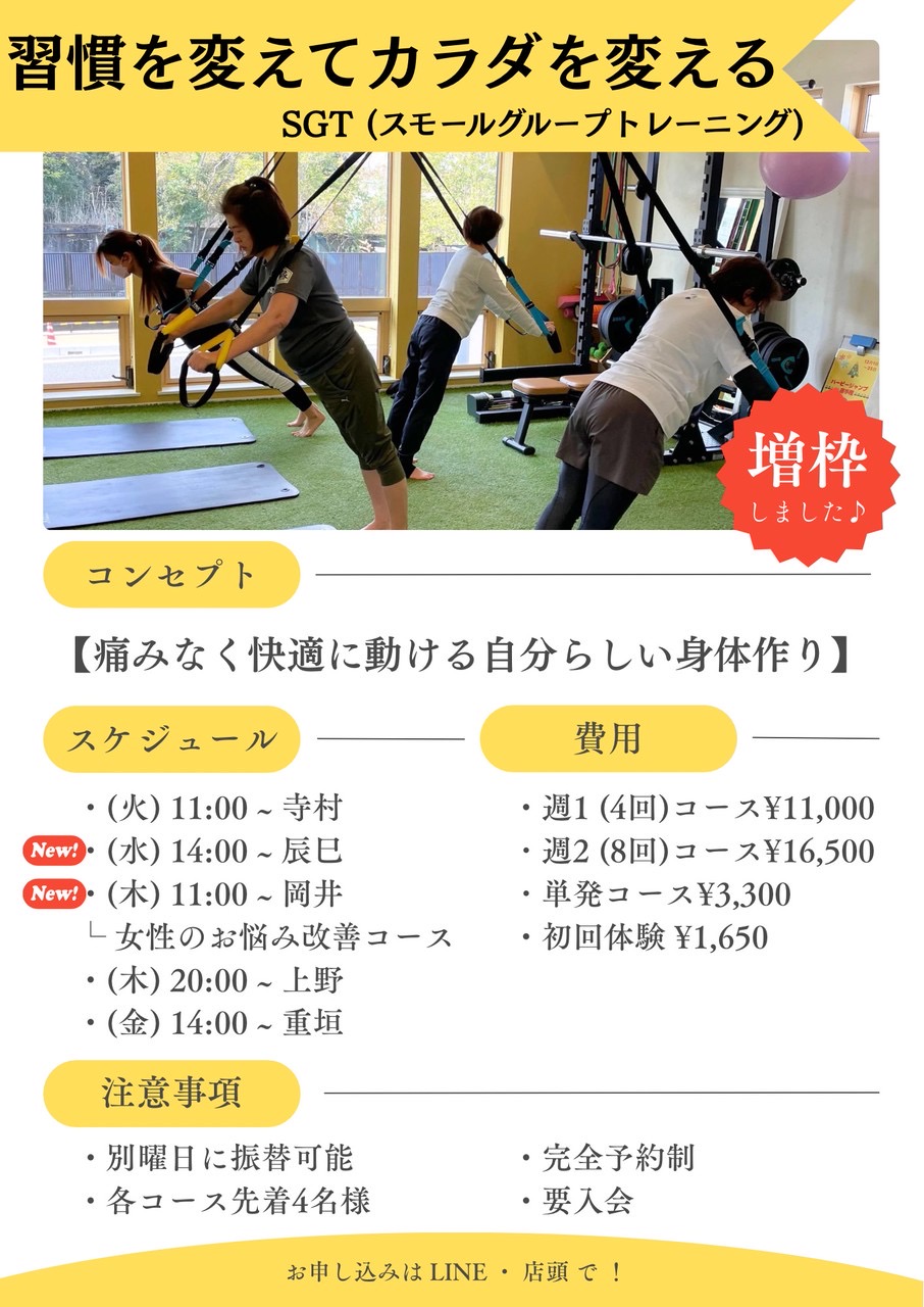3月のグループレッスンのお知らせです!🎎🍡 【 3月より✨増枠決定✨ 】 辰巳・岡井のクラスが追加され、 より通いやすくなりました😊 岡井のクラスは女性限定👸🏻 産後や尿漏れ等のお悩みにフォーカスした内容です! 少人数制なので 運動が苦手な方や初心者の方も安心してご参加いただけます♪ 脂肪燃焼&シェイプアップだけでなく、 快適に動ける身体作りを目指します✨ ★3月は【無料】で参加可能です‼️ (辰巳、岡井クラスのみ) 体験希望の方はこのLINEにご返信ください😊 https://lin.ee/OSkx8fh 🤝 40代・50代からの体力づくり/痛み改善/運動初心者なら 京都府宇治市のパーソナルジム 【GOEN】へ ✅ 肩こり・腰痛・膝の痛みなど不調を整えたい ✅ 体力低下・疲れやすさを変えたい ✅ 姿勢改善・見た目を引き締めたい(ダイエットも) ✅ ジムが初めてで何から始めたらいいか不安 マシンだけに頼らず、姿勢・呼吸・動きから整えて あなたの身体に合わせたメニューで、無理なく続けられます😊 📩 ご予約:リンクから簡単予約(見学・体験OK) 🏠 〒611-0021 京都府宇治市宇治里尻72-22 🚗 駐車場あり